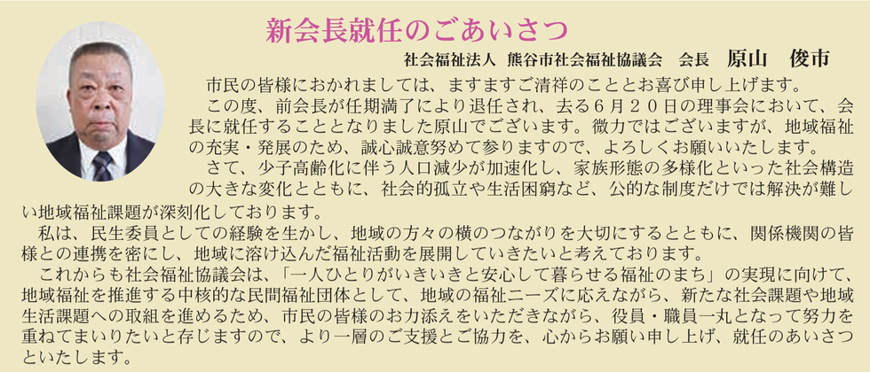 ○2025/10/11 熊谷市社会福祉協議会 熊谷市社会福祉協議会の会長に原山さんが就任されました。 https://kumagaya-shakyo.jp/ |