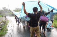 雨具のある人は合羽や傘を差し、雨具の準備の無い人たちは、ブルーシートを頭