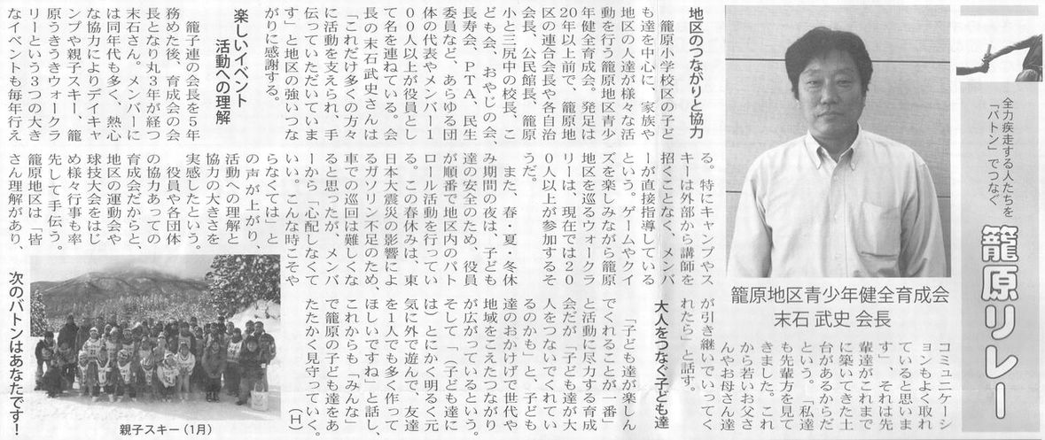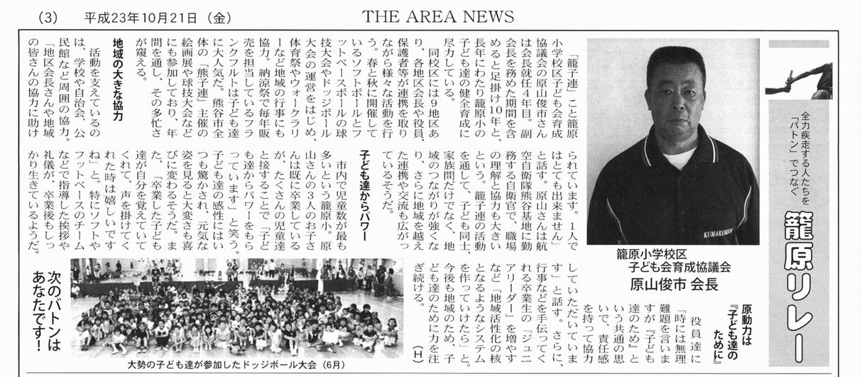 ○2011/05/20 エリアニュース AREAニュースの籠原リレーに育成会会長の末石さんの記事が掲載されまていました。 |
