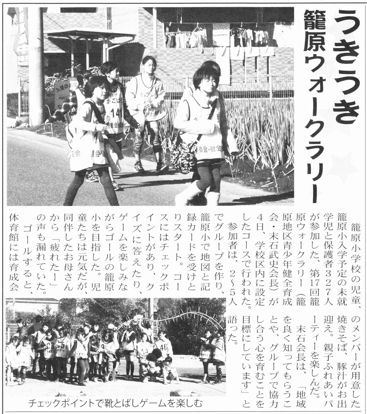 ○2011/12/04 健全育成会 ウォークラリー 90チーム。総勢327人が、籠原の町中を元気に歩きました。各チェックポイントでは、ゲームやクイズを行いました。 詳細はこちら |