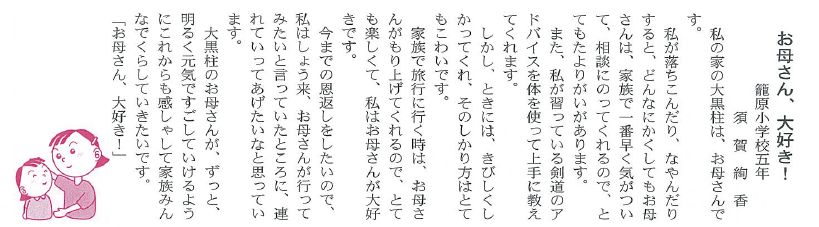 ○2012/02/15 熊谷市青少年健全育成市民会議 「くまがや だんらん」に籠原小学校児童の作文と 絵が掲載されました。 |