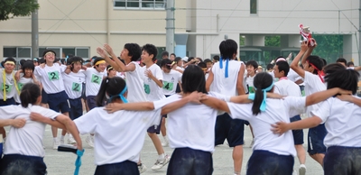 終了後、 一つのクラスが、輪になって喜びを表現し始め、その輪が他のクラスにも伝わり、 最後には、三年生全員が肩を組み、一つの大きな輪になっていました。