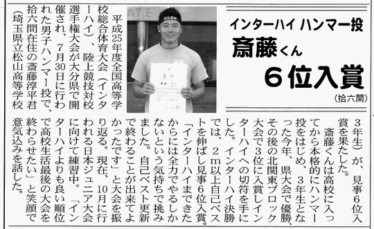 ○2013/7/30 全国高等学校総合体育大会 大分市スポーツ公園大分銀行ドームにて行われた、男子ハンマー投げで、齋藤君(松山高)が59m89で、見事6位になりました。おめでとうございます。競技の結果はこちら 2013/8/16のエリアニュースにも掲載されました。 |