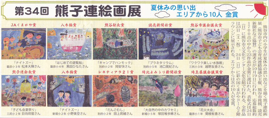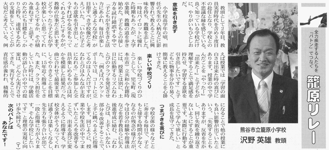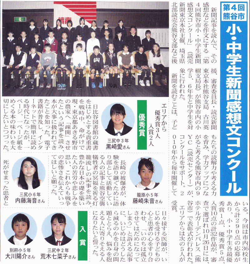 ○2013/11/15 エリアニュース AREAニュースに小・中学生新聞感想文コンクール、籠子連絵画展、籠原小学校沢野教頭先生の記事が掲載されました。 |