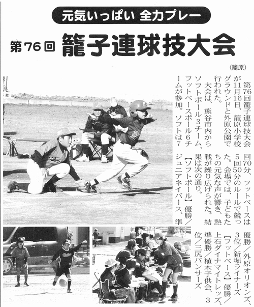 ○2013/11/16 籠子連 第76回球技大会 籠子連主催の球技大会が開催されました。ソフトボールは、籠原小学校グラウンド。 フットベースボールは、外原公園に分かれて行われました。詳細はこちら |