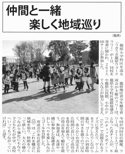 ○2012/12/01 育成会 ウォークラリー 第19回籠原うきうきウォークラリーが開催されました。68チーム、267名が籠原の町中を元気に歩きました。詳細はこちら |