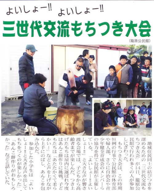 ○2013/12/20 AREA NEWS 12/20発行のAREA NEWSにて、籠子連の球技大会、育成会のウォークラリー、公民館の三世代餅つき大会の様子が紹介されました。 |