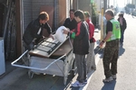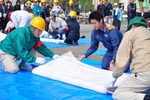 担架作成訓練 (物干し竿、毛布・ジャンパーを使って担架作成訓練)