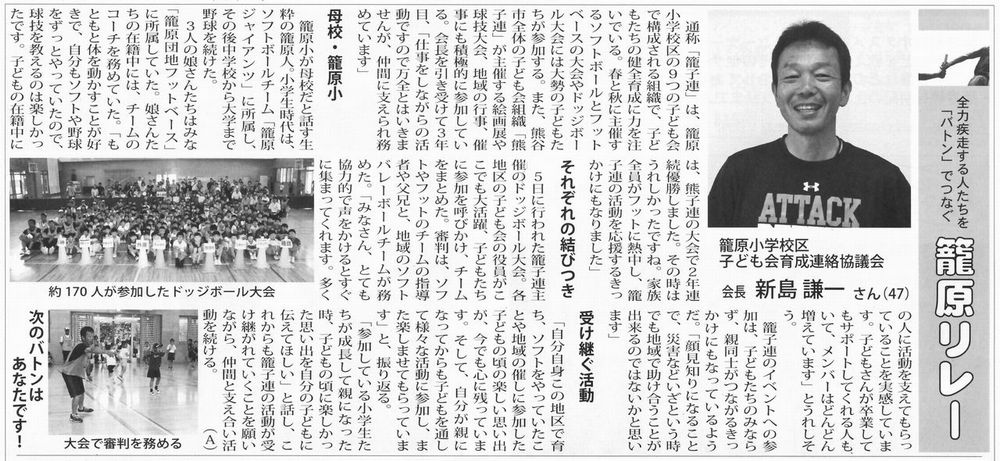 ○2016/06/17 AREA NEWS AREA新聞の籠原リレーに籠子連新島会長の 記事とドッジボール大会の様子が掲載されま した。 (記事をクリックすると、記事が拡大します) |