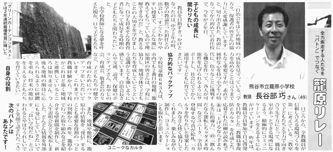 ○2016/10/21 AREA NEWS AREA新聞の籠原リレーに籠原小学校長谷部教頭先生の記事が掲載されました。(記事をクリックすると、記事が拡大します) |