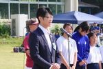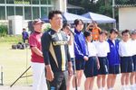籠原小学校校長、籠原小学校PTA会長による始球式。
