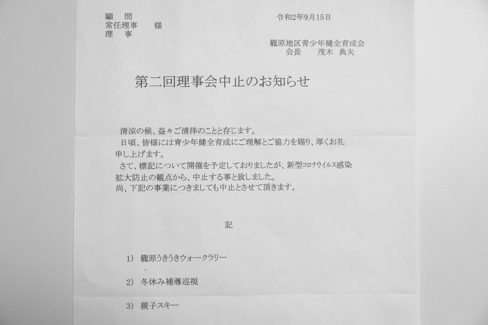 ○2020/09/19 育成会 理事会中止 籠原地区青少年健全育成会の第ニ回理事会は、新型コロナウイルス感染拡大防止の観点から開催しないこととなりました。以下の事業も中止とさせていただきます。 1 籠原うきうきウォークラリー 2 冬休み補導巡視 3 親子スキー |
