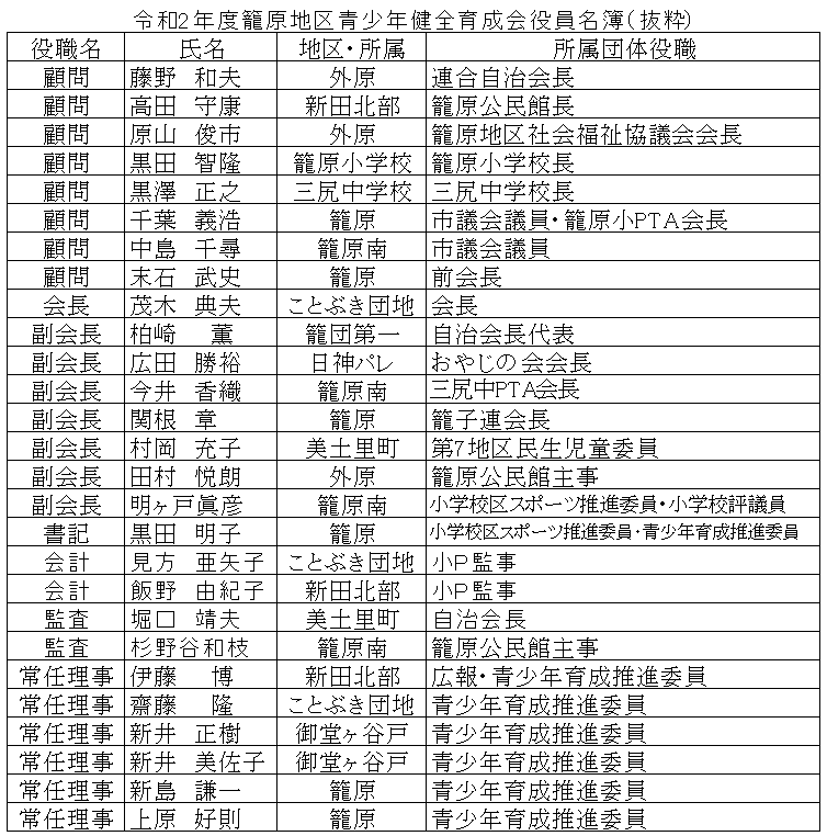 ○2020/06/06 育成会 理事会中止 6/27(土)に予定していた籠原地区青少年健全育成会の第一回理事会は、新型コロナウイルス感染防止観点から開催しないこととなりました。 以下の事業も中止とさせていただきます。 1 デイキャンプ 2 籠原地区納涼祭参加 3 夏休み補導巡視 |
